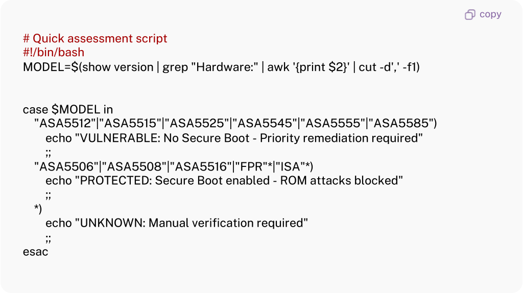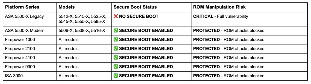 This distinction changes everything. Legacy ASA meant permanent compromise. Secure Boot devices? Still vulnerable, but survivability was blocked.