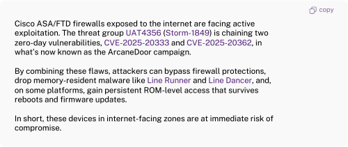 “Hey, Vinay, we’re getting flooded with noise about these two new Cisco ASA/FTD vulnerabilities that CISA posted the emergency advisory on.