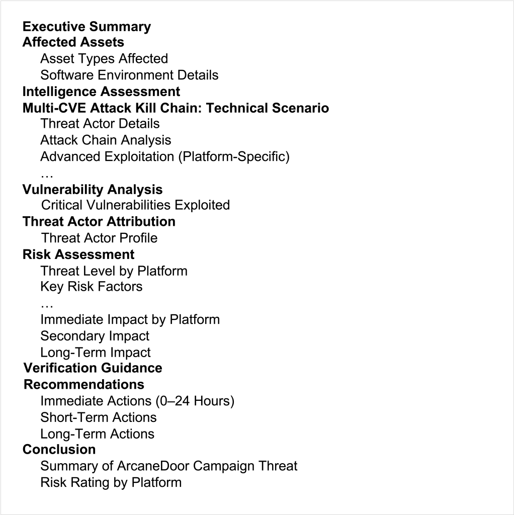 The overall structure of the Balbix Deep Research output report for an emerging threat is this.